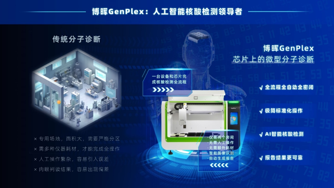 博暉GenPlex系統將DNA提取、純化、PCR擴增、雜交檢測和結果判讀所有核酸檢測步驟高度集成在7*8cm大小的微流控芯片,采用AI人工智能算法,進行全程監控,Robot機械臂精準完成每一步操作, 檢測結果可視圖像化,AI自動判讀。國內首次真正實現核酸檢測的集成化、標準化、人工智能化。